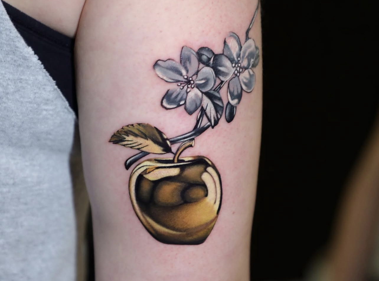 Tattoo featuring a metallic gold apple with a branch of monochromatic blossoms, blending realism and surrealism on the upper arm.