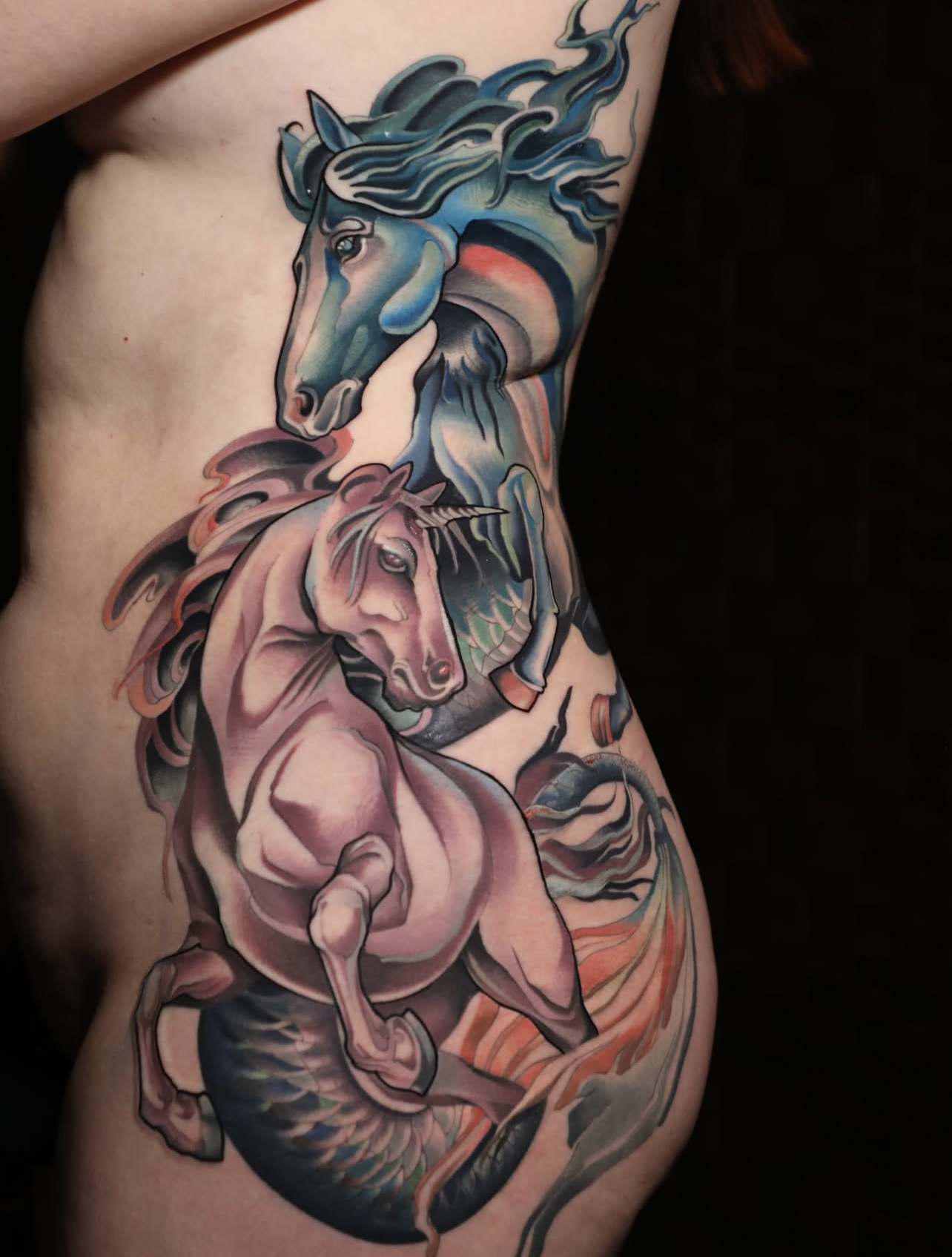 Full side tattoo of two dynamic, stylized horses—one a unicorn—depicted in vibrant blues and pinks with flowing manes and scales.