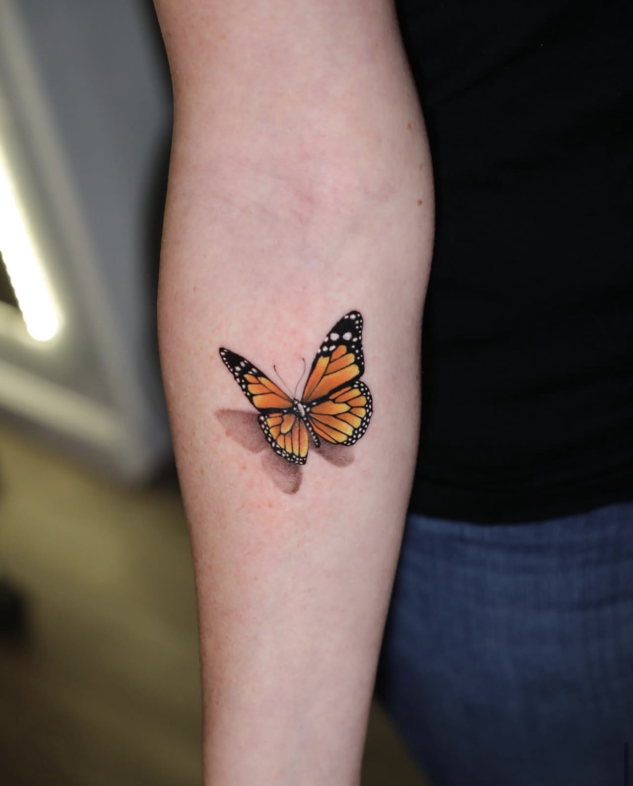 Realistic tattoo of an orange and black monarch butterfly in mid-flight, with a subtle drop shadow to create a 3D effect.
