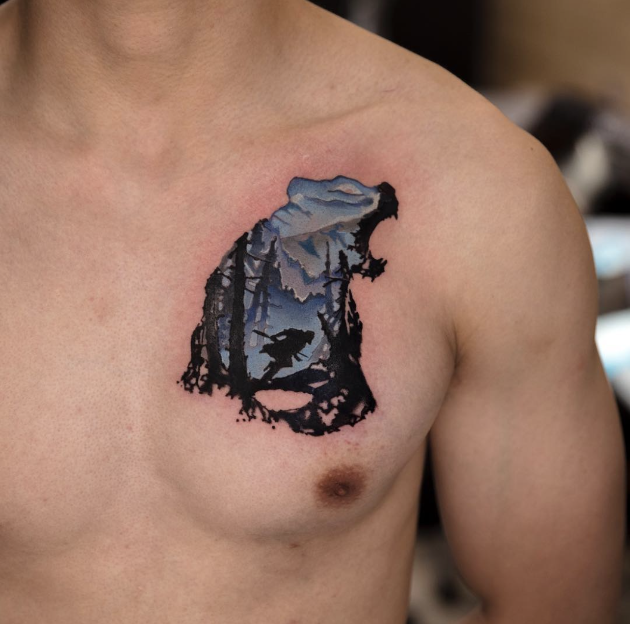 Mountain landscape chest tattoo in the shape of a bear silhouette, featuring trees, a fish, and a hiker.