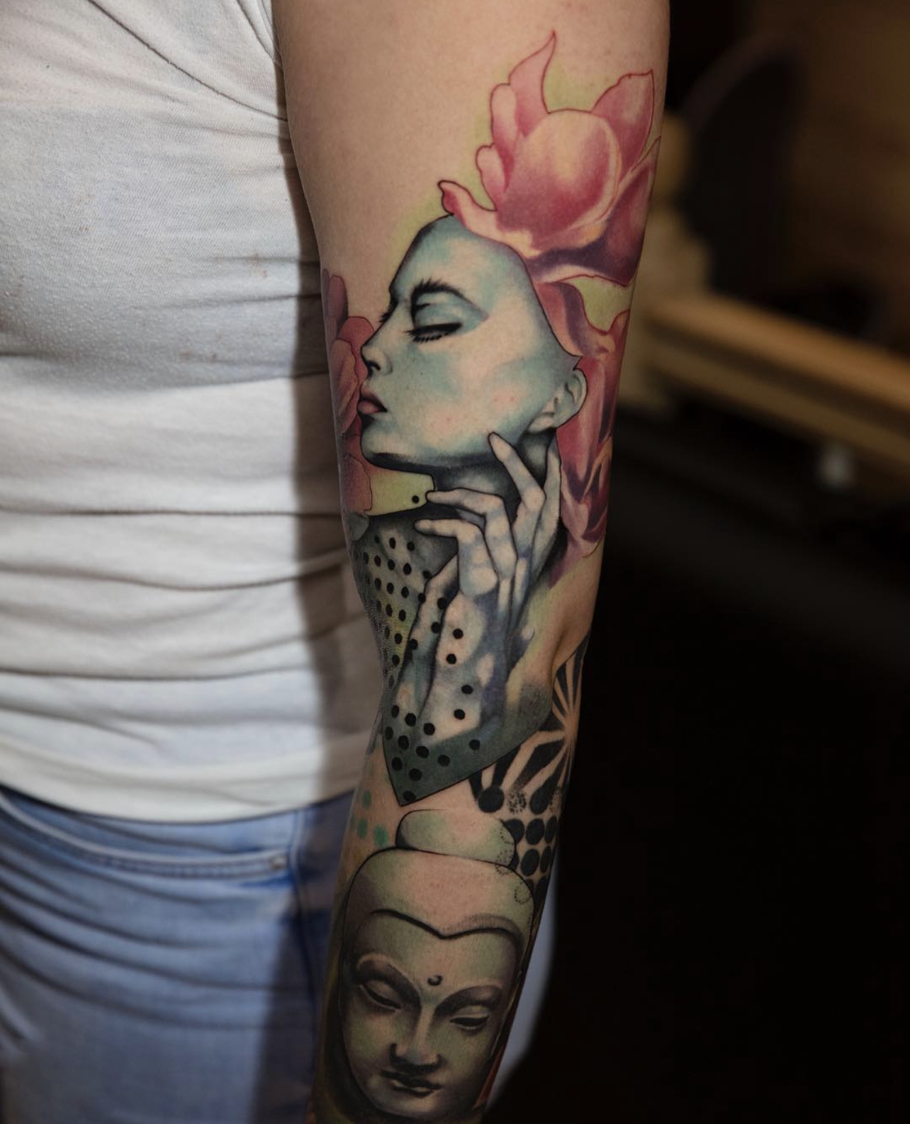 Full arm sleeve tattoo featuring a surreal female face, pink flowers, abstract patterns, and a serene Buddha portrait.