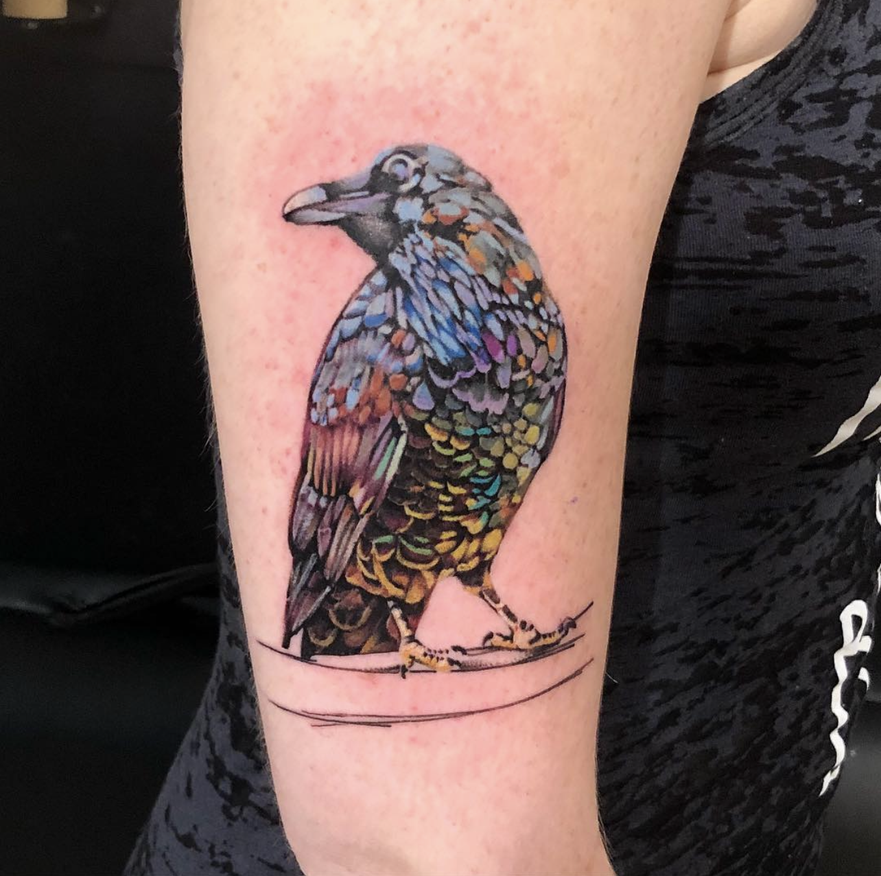 Detailed multicolor crow tattoo with iridescent feathering and fine line perch, located on the upper arm.