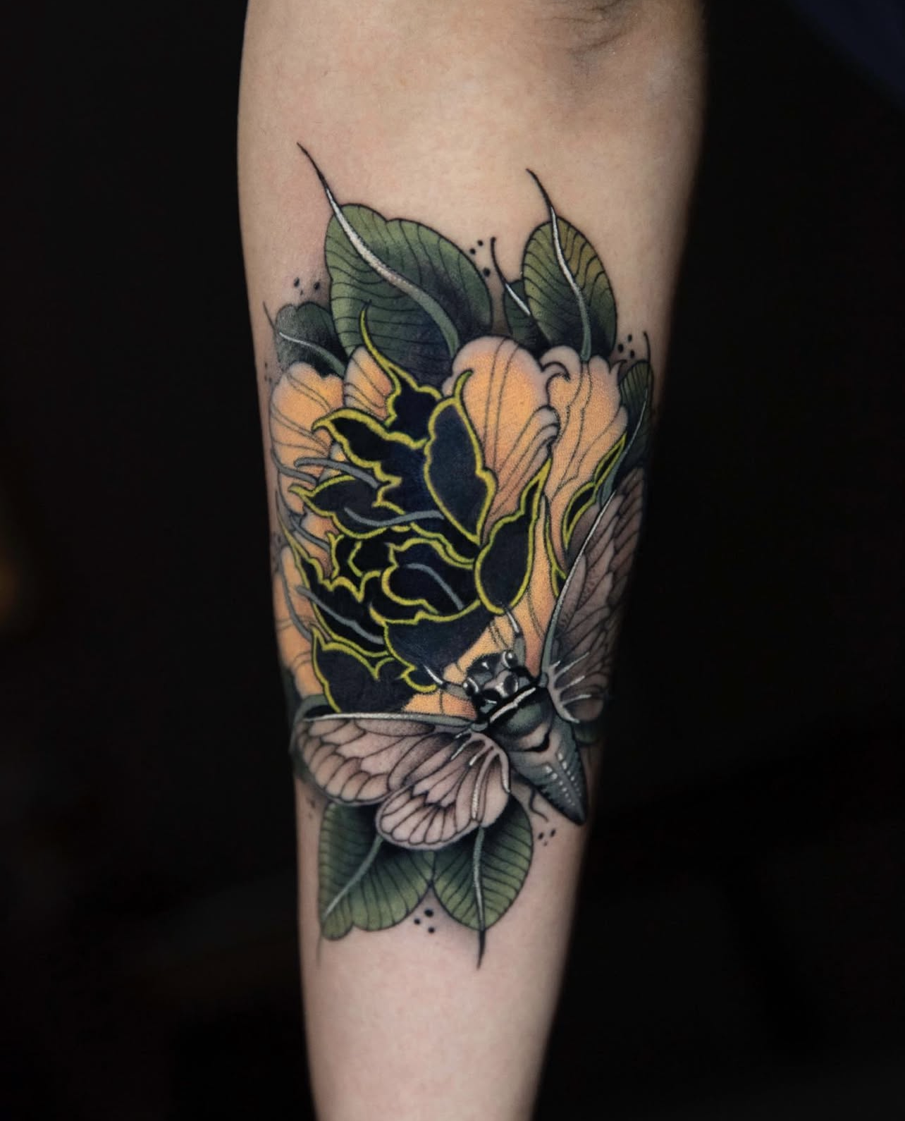 Neo-traditional tattoo of a vibrant flower cluster with a large moth in the foreground, inked in rich yellow, green, and black hues.