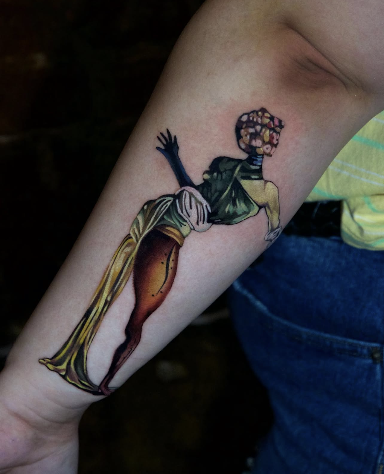Tattoo of an abstract, high-fashion humanoid figure with a head made of roses and elongated stylized limbs, placed on the fore arm.