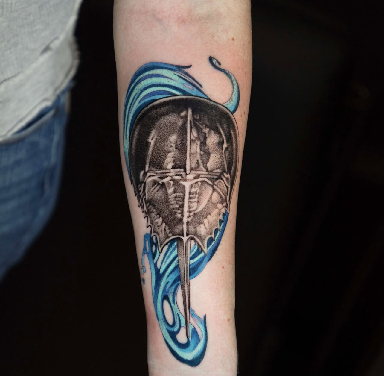 Realistic black and grey horseshoe crab tattoo with dynamic blue wave elements on the forearm.
