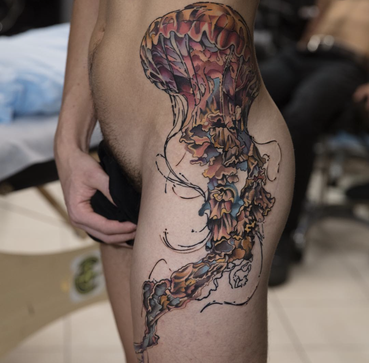 Flowing jellyfish thigh tattoo with painterly textures, rich oranges and purples, and expressive organic linework.