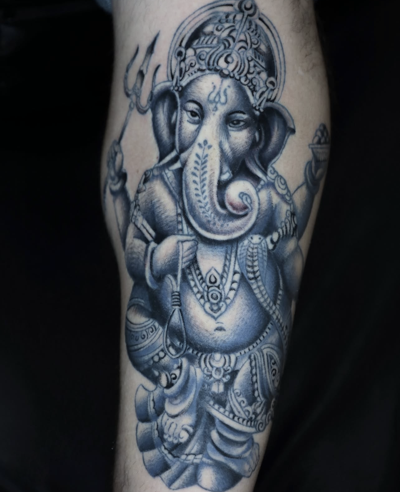 Ornate black and grey tattoo of the Hindu deity Ganesha, featuring fine shading and intricate traditional iconography on the leg.