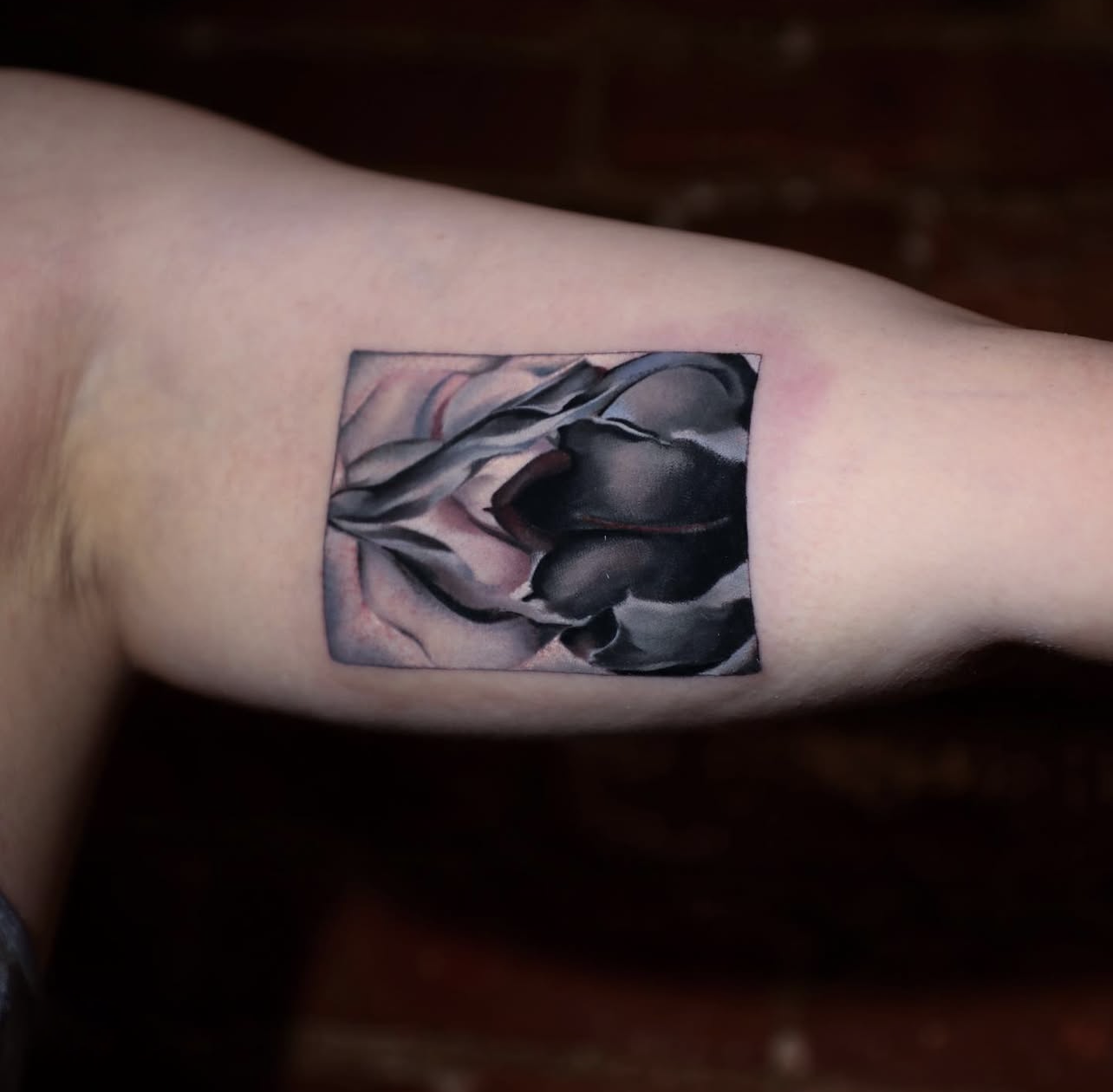 Surreal black and grey floral tattoo resembling Georgia O'Keefe with deep shading and soft petal folds, inked on inner bicep.