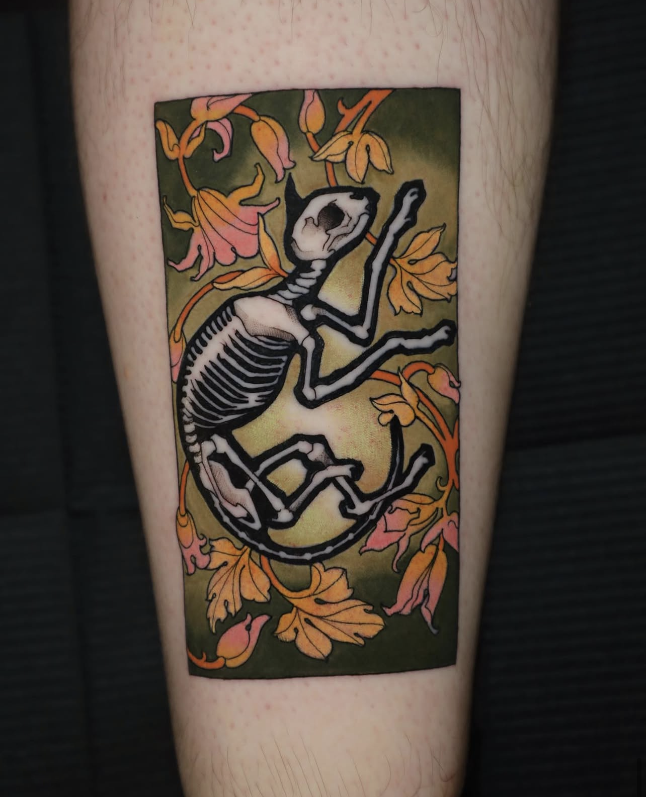 Colorful tattoo of a curled cat skeleton surrounded by orange and pink flowers in a rectangular frame on the leg.