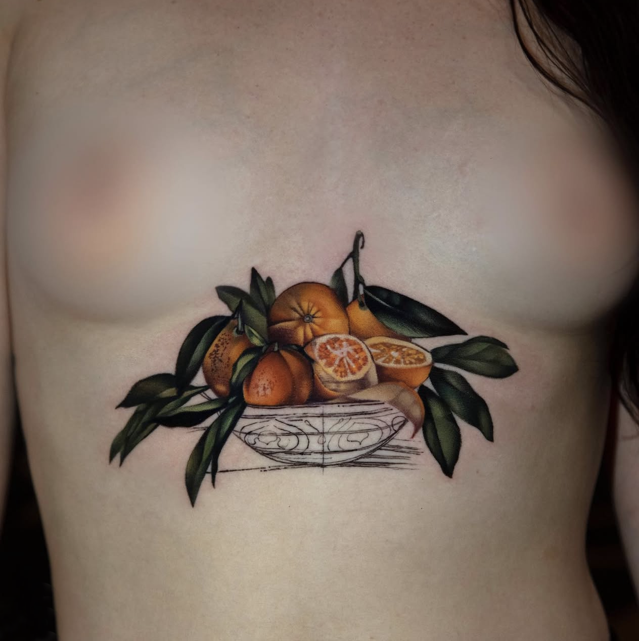 Hyper-realistic tattoo of oranges, leaves, and a pear in a classic bowl on a person’s chest, resembling a Renaissance still life painting.
