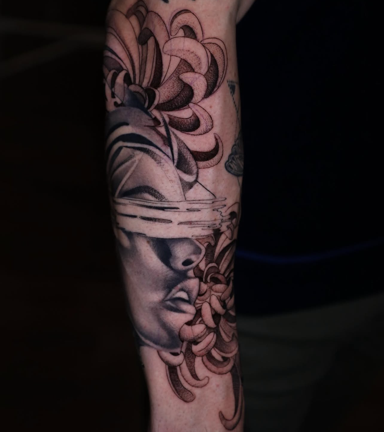 Detailed grayscale tattoo of a veiled female face entwined with abstract chrysanthemum petals, spanning the forearm.