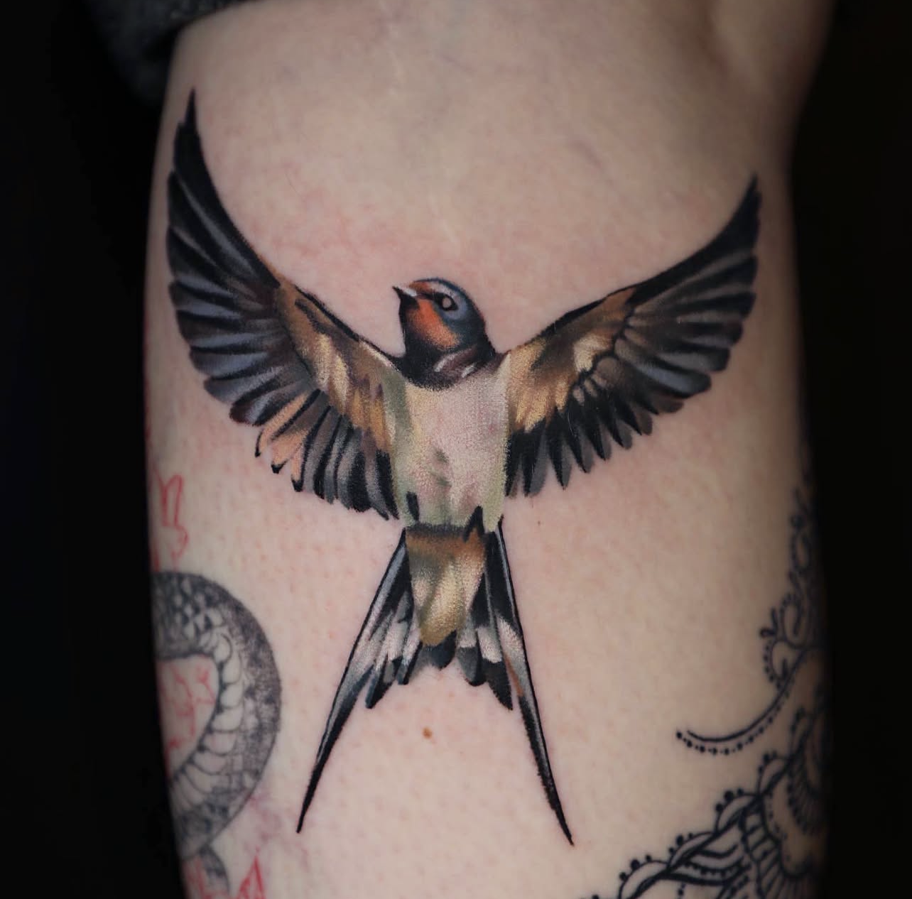 Tattoo of a classic-style swallow in flight, rendered with realistic shading and warm color tones on the arm.