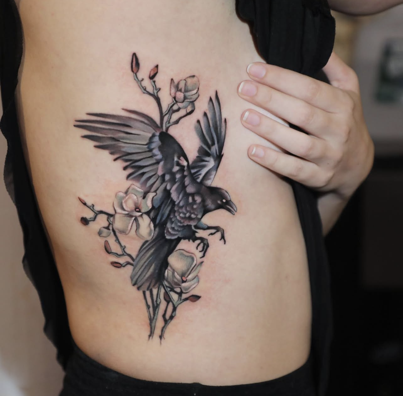 Tattoo of a soaring black raven surrounded by delicate magnolia flowers, inked along the side of the ribcage.