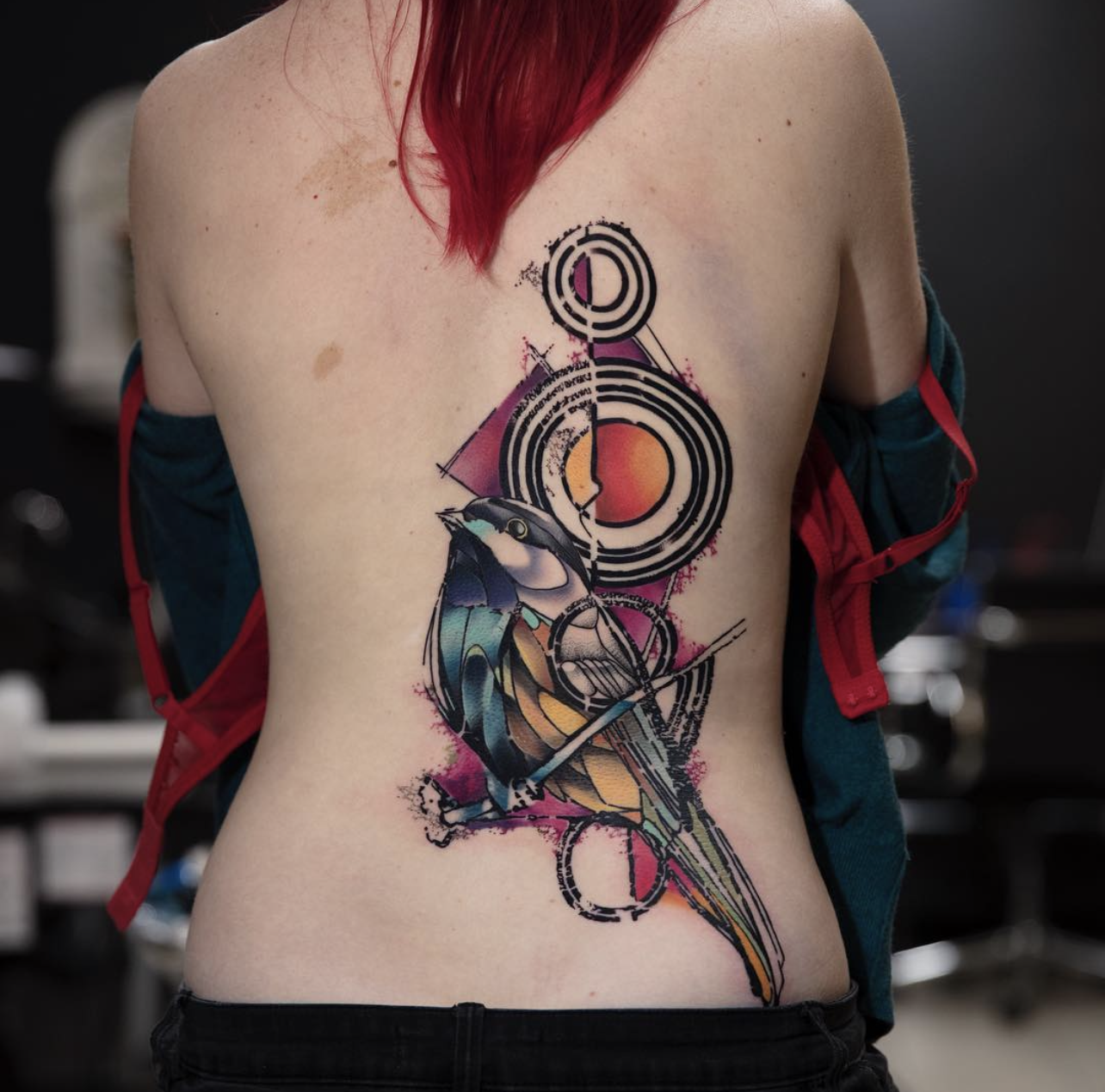 Vibrant bird tattoo on back with geometric circles, layered abstract shapes, and watercolor-style effects.
