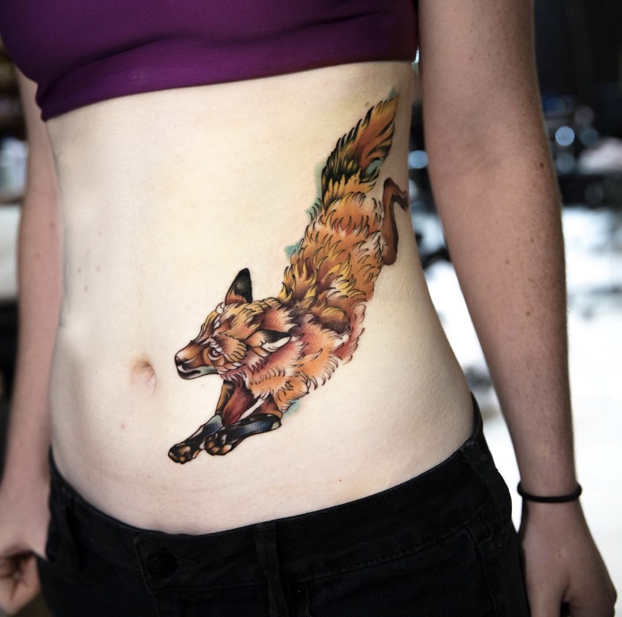 Whimsical fox tattoo in motion with stylized orange fur, placed along the side ribcage.