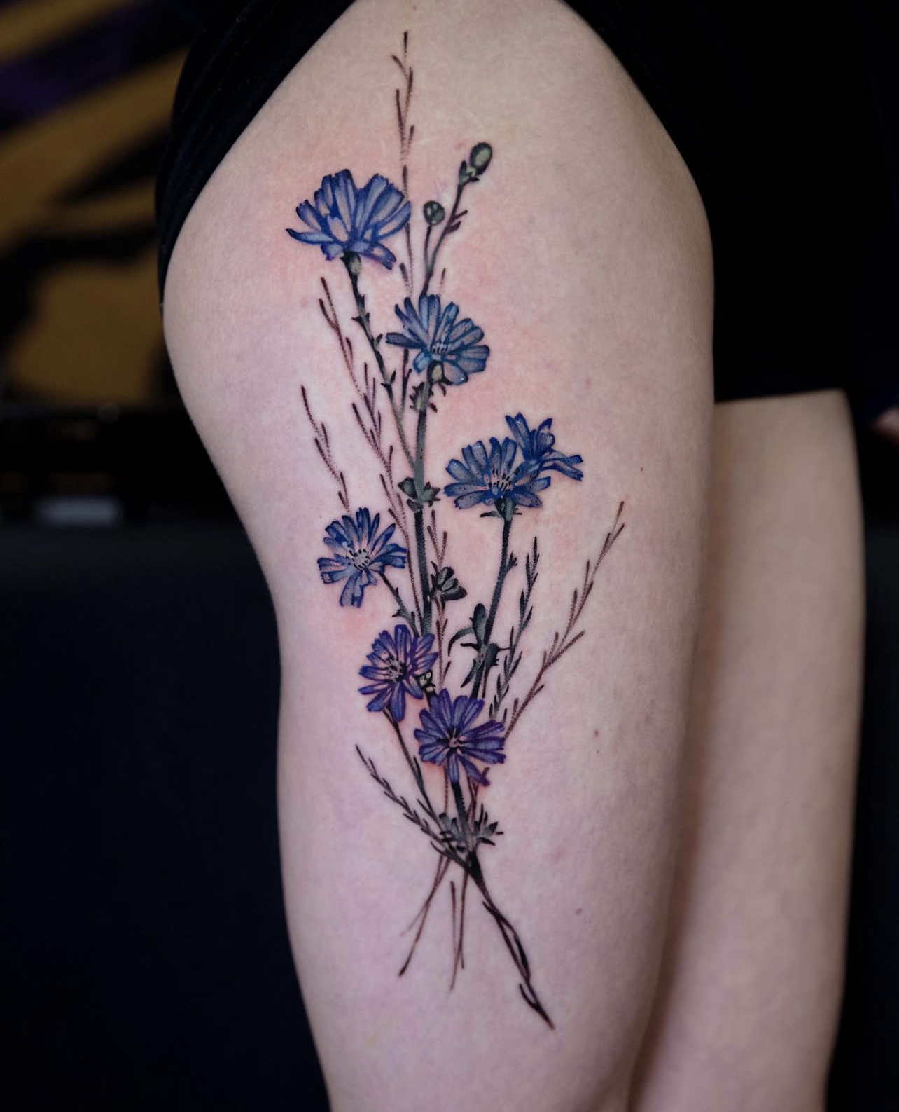 Tall sprig of blue cornflower tattoo on thigh with fine line branches and soft violet hues