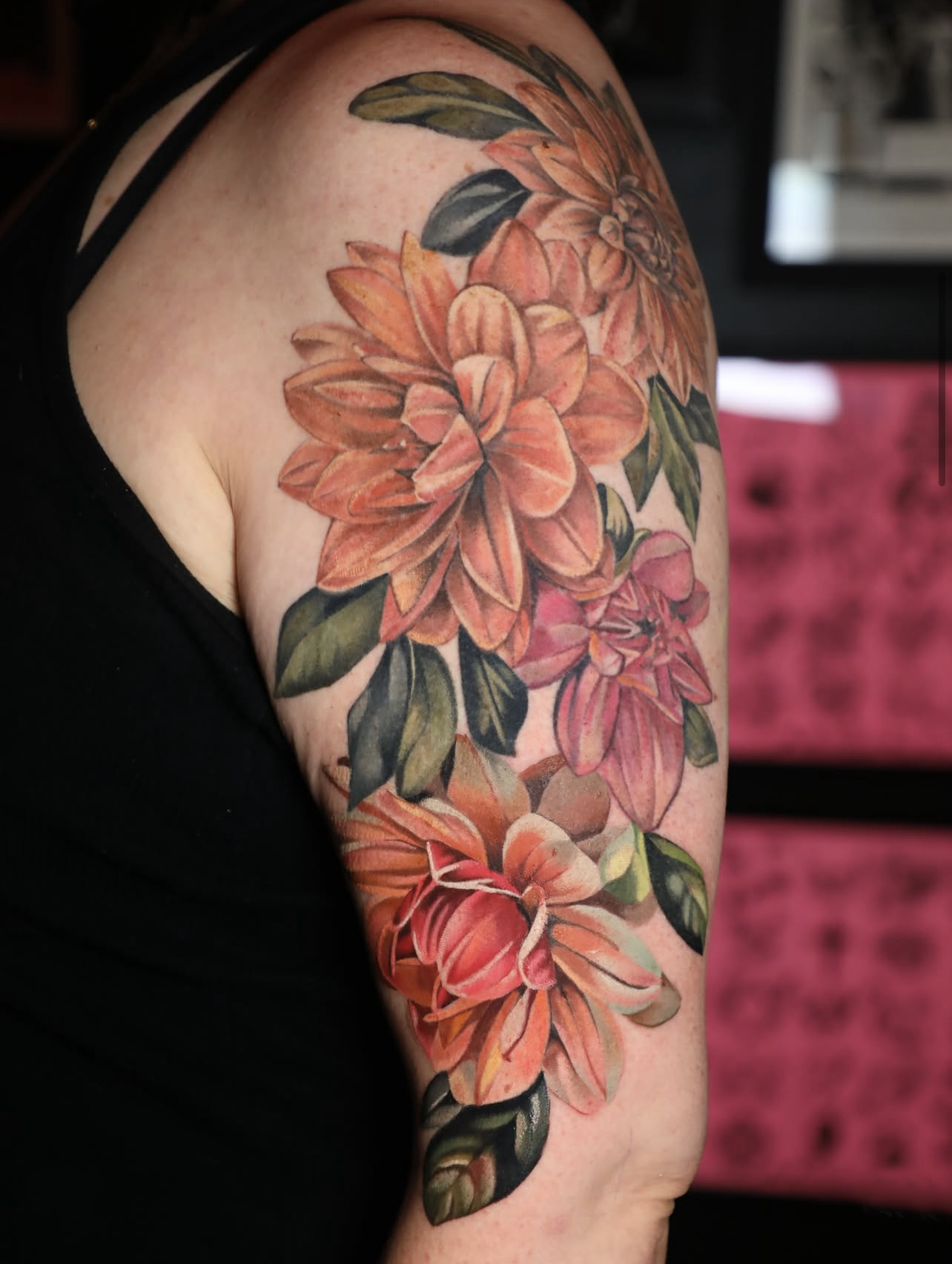 Realistic orange dahlia sleeve tattoo on upper arm featuring soft shading and lush green leaves