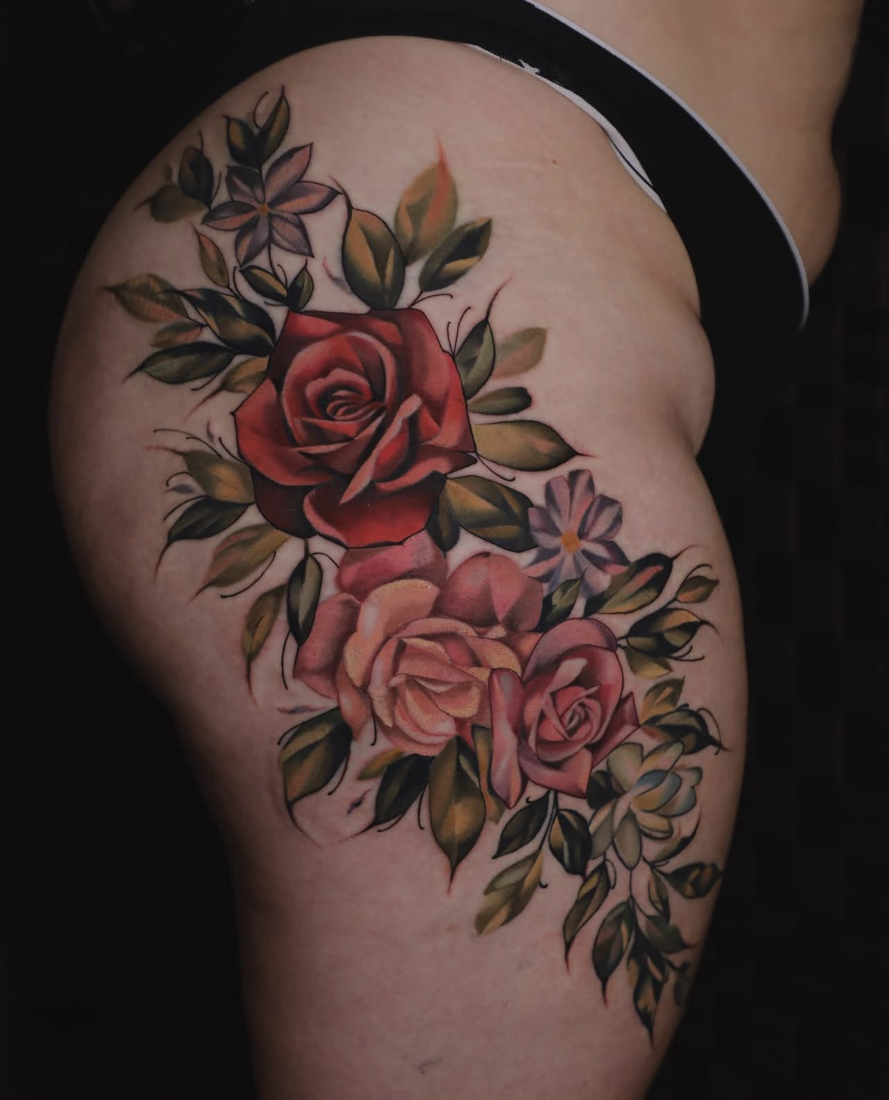 Large floral tattoo on hip featuring red, pink, and blush roses surrounded by olive green leaves and accent flowers