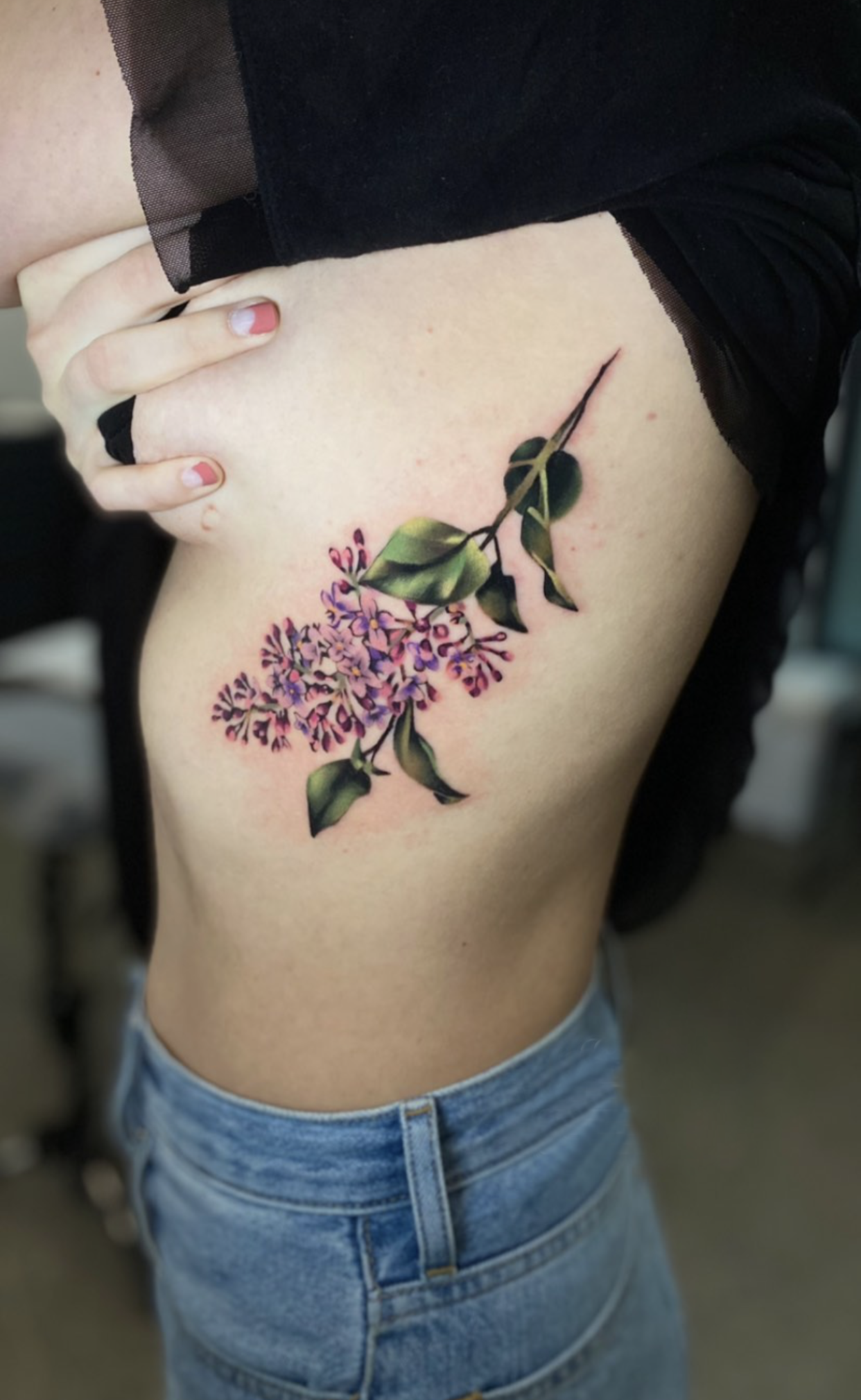 Soft lilac flower tattoo on ribcage with purple blossoms, green leaves, and a natural branch composition