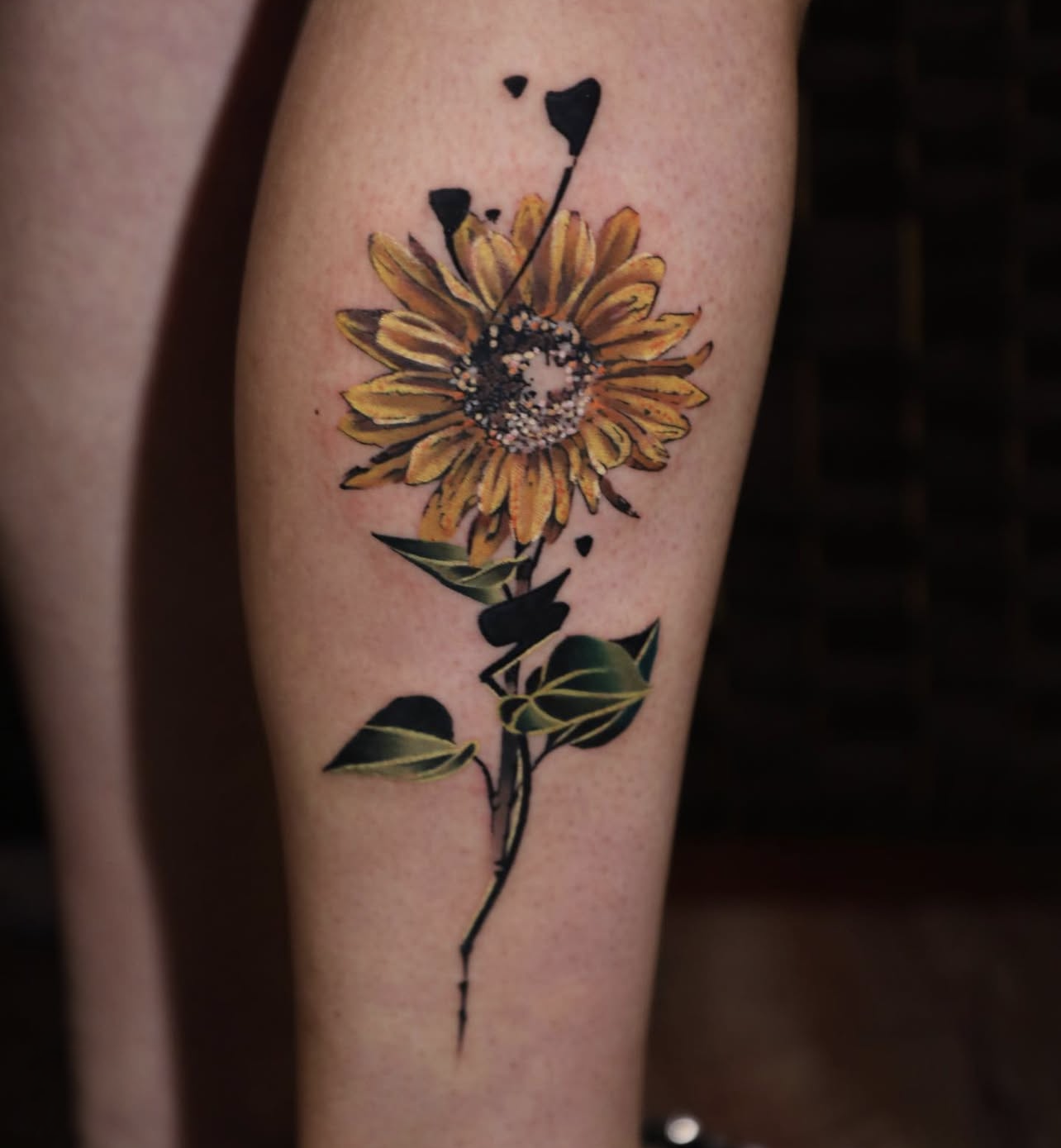 Bold sunflower tattoo with artistic black ink splatter on calf, blending realism and abstract