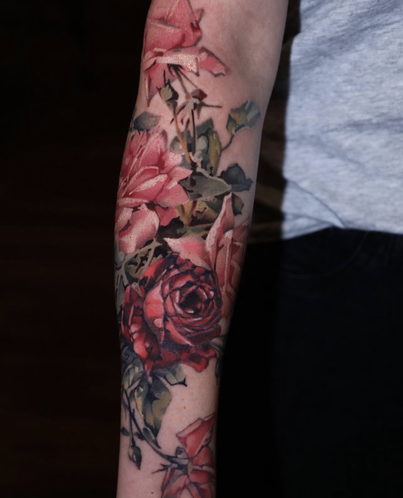 Full forearm sleeve tattoo of realistic red and pink roses with layered botanical elements and intricate shading