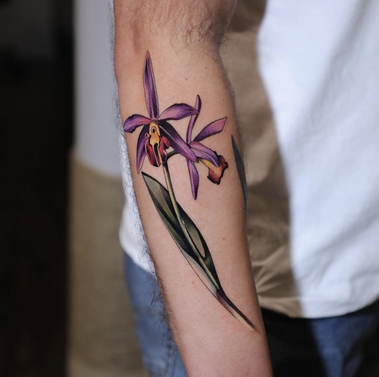 Elegant purple orchid flower tattoo on inner forearm with slender green leaves and fine detail