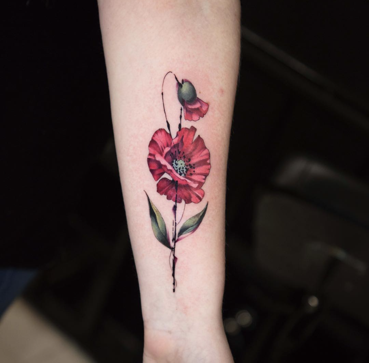 Minimalist red poppy flower tattoo on forearm with fine black line detailing and natural leaf tones