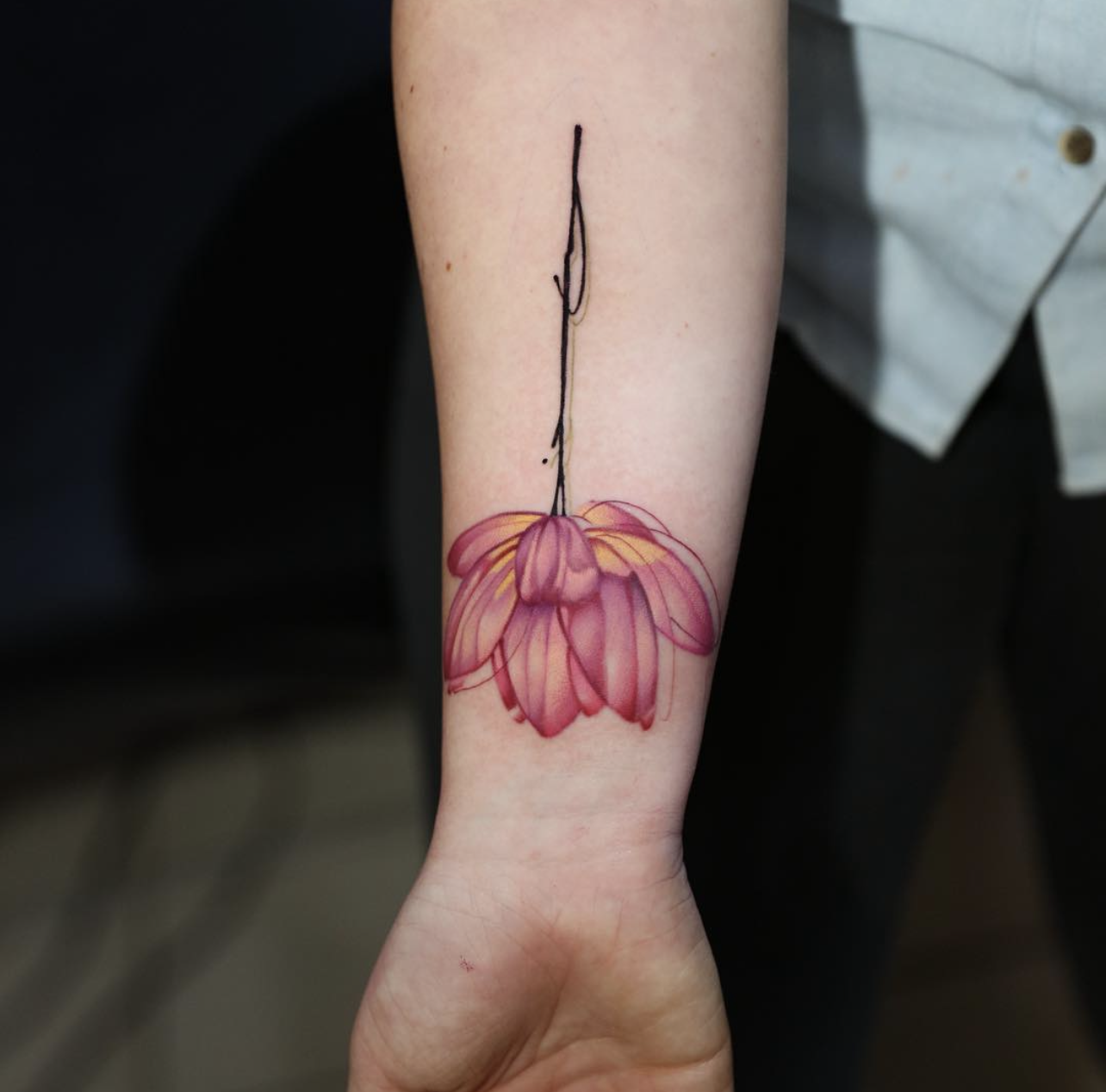 Hanging pink coneflower tattoo on wrist with fine line stem and soft gradient petals