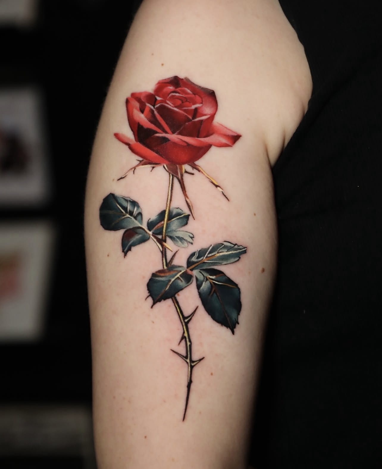 Bold red rose tattoo with thorned stem and dark green leaves on upper arm, fine line detail
