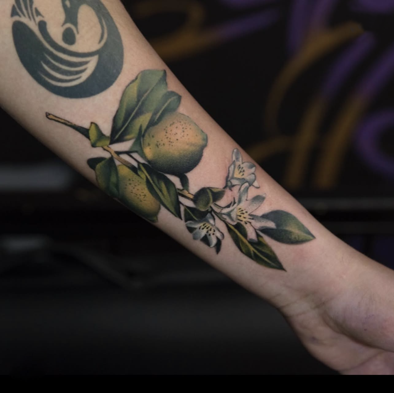 Botanical lemon tree tattoo on forearm with green citrus fruit, white blossoms, and deep foliage