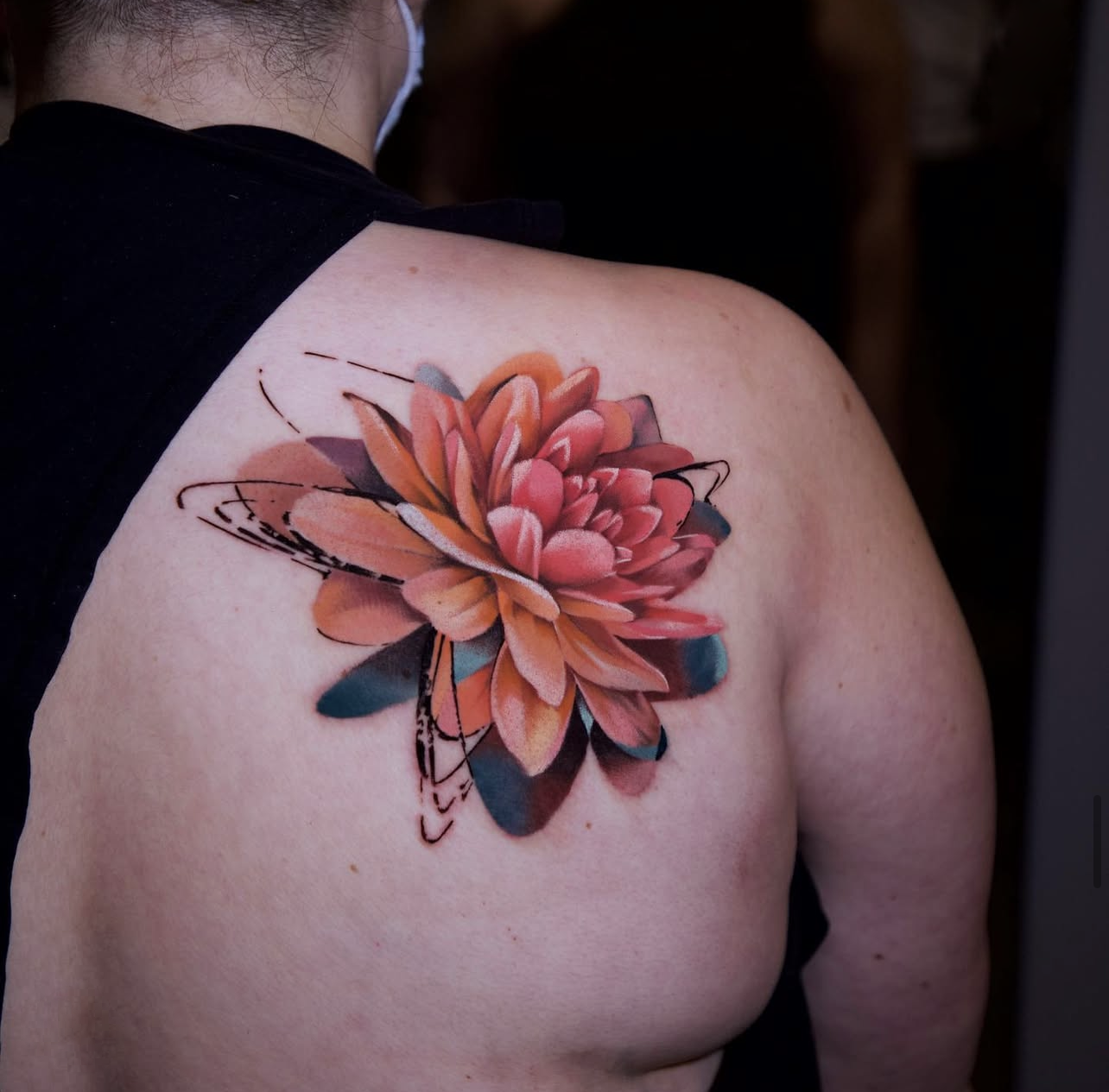 Large orange and pink lotus flower tattoo on shoulder blade with soft shading and orbiting ink lines