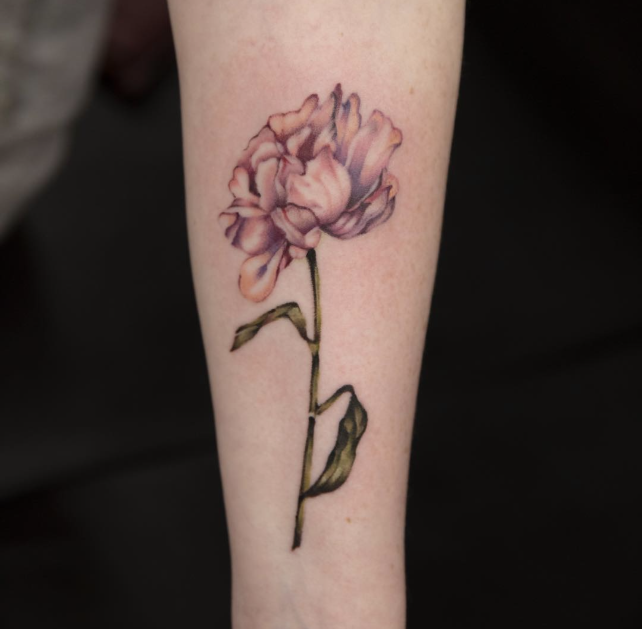 Soft pink peony flower tattoo on inner forearm with subtle watercolor shading and delicate leaves