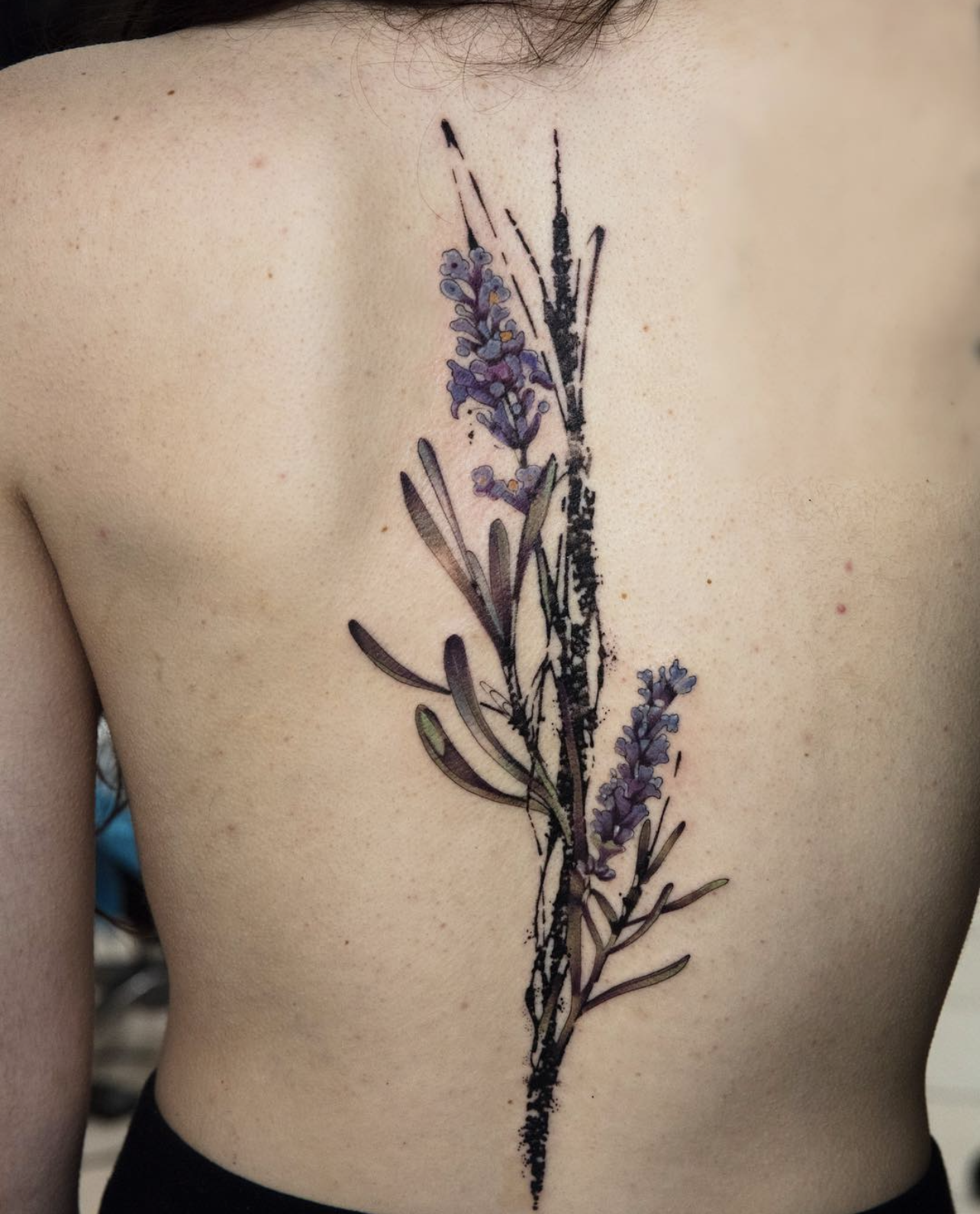 Elegant lavender sprig tattoo along spine with dark ink brush accents and soft purple blooms