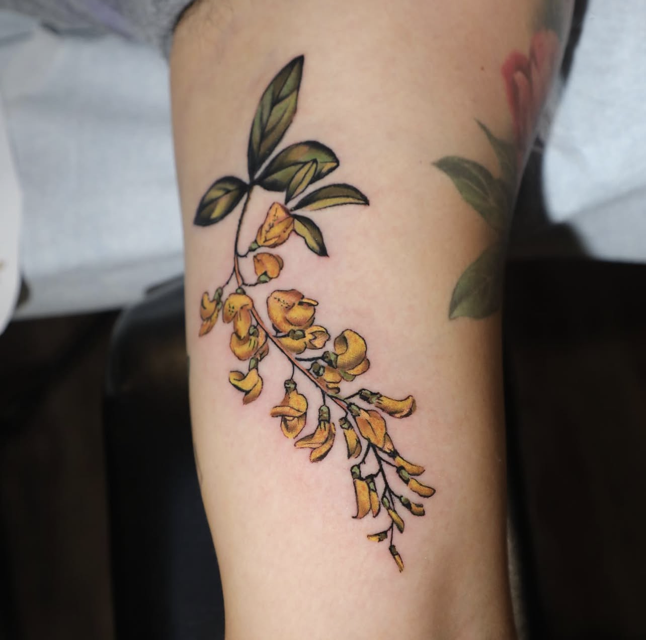 Yellow cascading laburnum flower tattoo on arm with botanical leaf accents