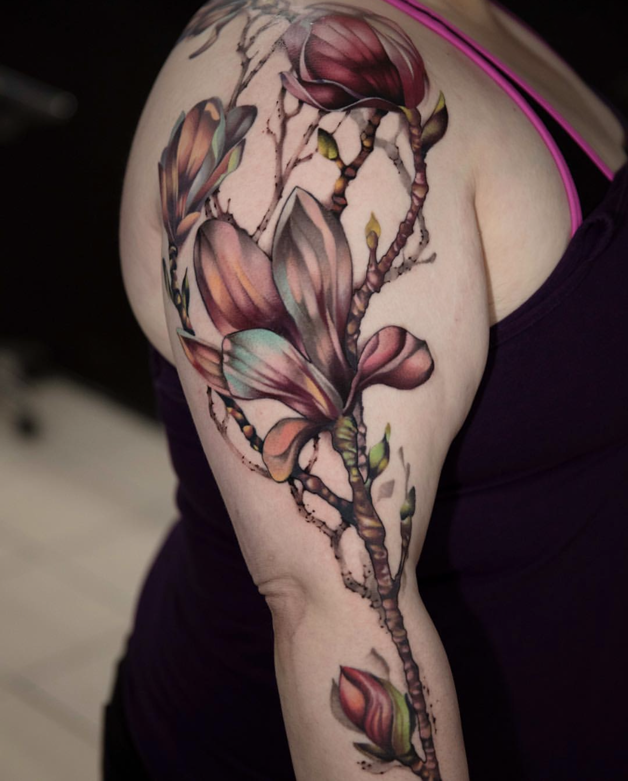 Flowing magnolia branch tattoo on arm and shoulder with large purple blossoms and naturalistic bark detail