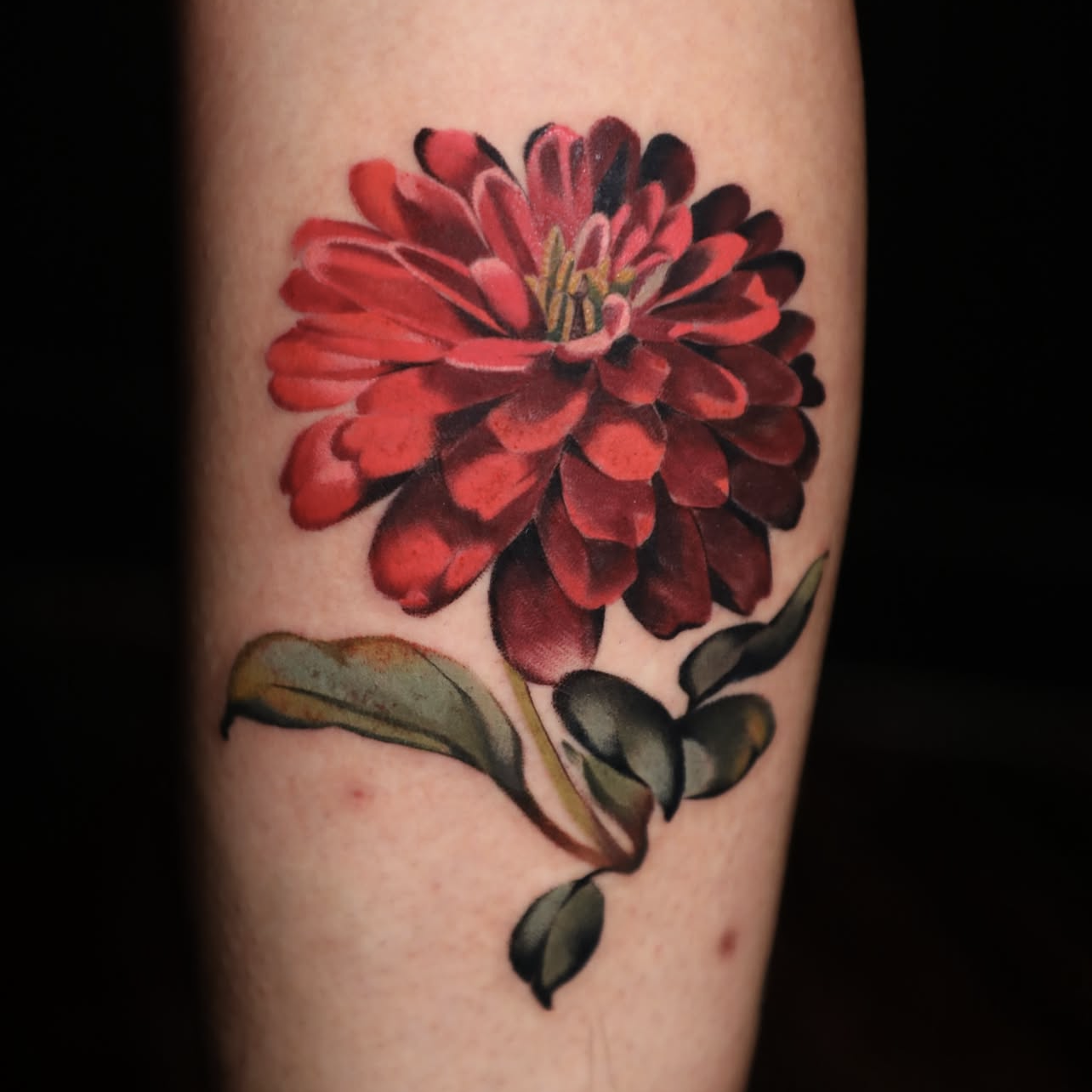 Realistic red dahlia flower tattoo on forearm with detailed petals and green leaves