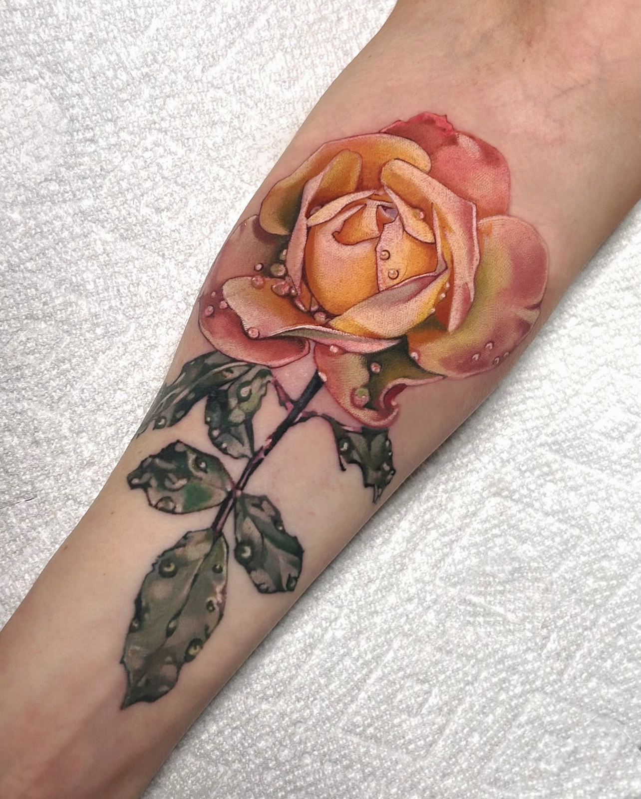 Yellow and peach rose tattoo with water droplets and green leaves on forearm, hyperrealistic style