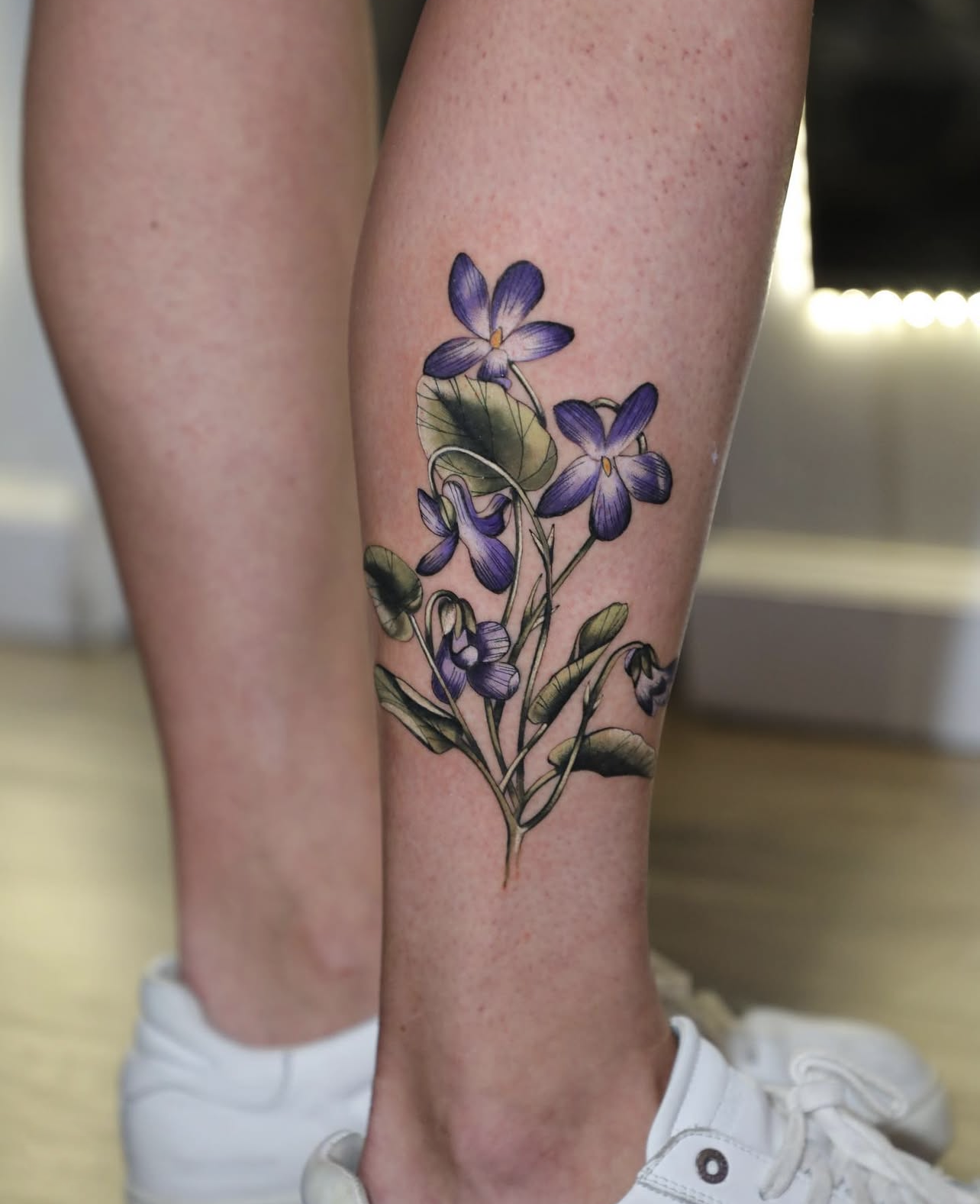 Violet wildflower tattoo on lower leg featuring delicate purple petals and soft green stems